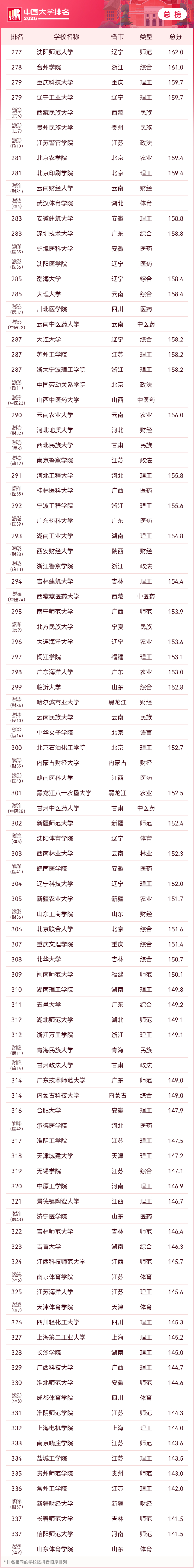2026软科中国大学排名(总榜)